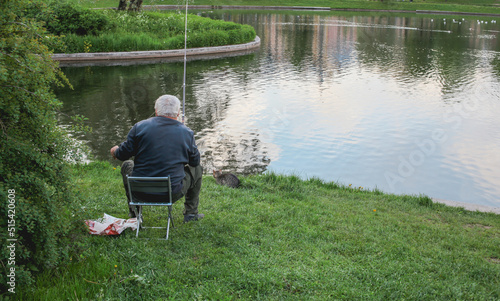An elderly male fisherman sits with a fishing rod on the shore of a lake in a city park. An elderly man is fishing in a city park in the evening twilight. The concept of active recreation.