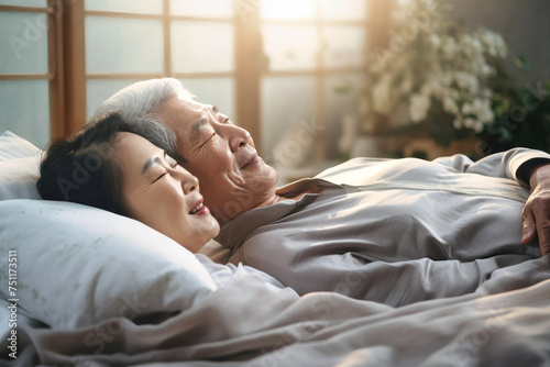 An elderly man and woman, an Asian couple deeply in love, are peacefully laying together in a bed