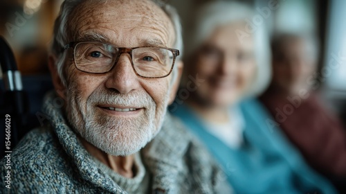 An elderly man smiles warmly at the camera, surrounded by friends in a cozy setting, capturing the essence of joy, companionship, and shared experiences in life.