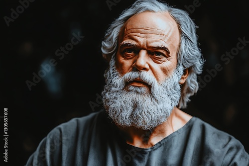 portrait, elderly, man, face, beard, grey, hair, wrinkled, skin, expression, serious, eye, nose, mouth, forehead, neck, chest, shoulder, clothing, garment, head, closeup, detail, lighting, shadow, tone, artwork, figure, old, wise, calm, focused, strong, contemplative, thoughtful, pensive, texture, human, person, male, looking, natural, soft, image, studio, dark, side