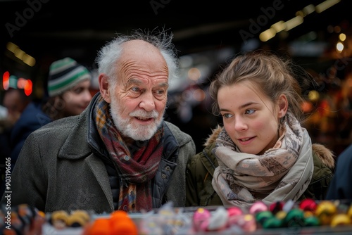 An elderly man with a scarf and a young woman with a ponytail explore a bustling market together, examining various colorful items and enjoying each other's company outdoors.