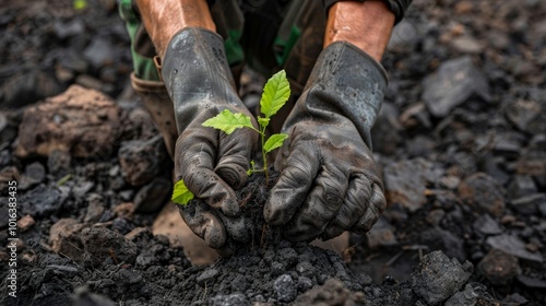 An elderly person in black gloves plants a green sapling in polluted, barren soil, symbolizing hope for environmental revival in a desolate landscape.
