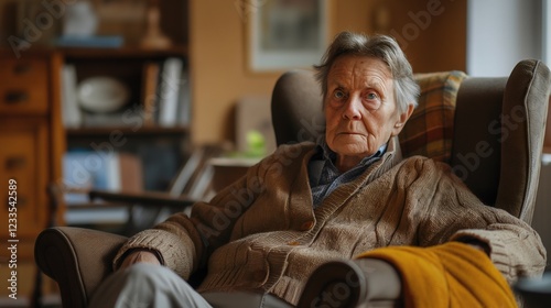 elderly, memory, loss, dementia, living, room, cosy, armchair, distant, gaze, challenge, safe, environment, loneliness, comfort, ageing, familiar, introspection, warmth, emotional, impact, solitude, caregiver, object, mindfulness, family, vulnerability, serenity, care, mental, health, introspective, home, nostalgia, chair, quiet, compassion, awareness, support, resilience, sharpened, well-being
