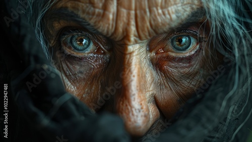 An elderly woman gazes intensely with blue eyes, her face lined with age, wrapped in a dark shawl, evoking a sense of mystery and wisdom