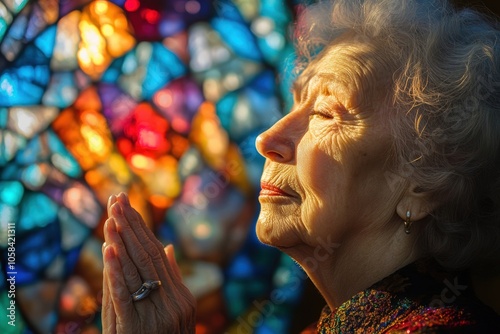 An elderly woman with closed eyes and clasped hands is praying peacefully in front of a vibrant