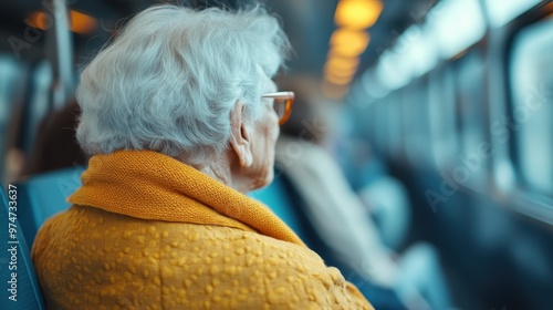 An elderly woman with white hair, wearing glasses and a yellow scarf, gazing out a window during a journey on public transportation, highlighting solitude and reflection.