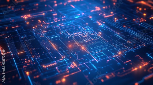 An electric blue glow illuminates the center of a close-up computer chip of complex blueprint algorithms for automotive lighting or construction.