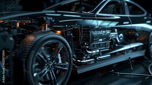 An electric vehicle's engine bay, highlighted in a dark setting with sharp, modern lighting, emphasizing its clean design and advanced technology