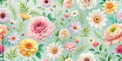 An elegant and minimalist seamless pattern showcasing an arrangement of fresh summer flowers in soft colors, creating a calming and soothing visual effect , bloom, garden flowers