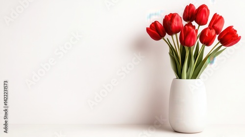 An elegant arrangement of bright red tulips in a sleek white vase set against a clean background. This image radiates warmth and beauty, perfect for floral advertising and decor.