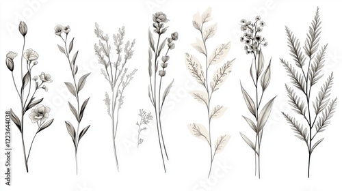 An elegant black line drawing of wildflowers and grasses, their minimalistic details standing out against a blank background.