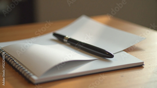 An elegant black pen lying on a blank notebook, ready for writing, in a warm and calm atmosphere.