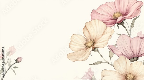 An elegant wedding invitation design featuring hand-drawn cosmos flowers and soft pastel accents.