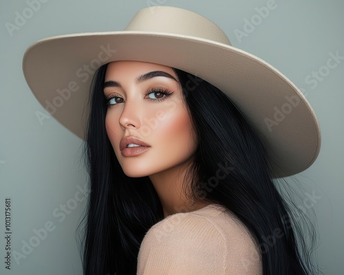 An elegant woman with long black hair, wearing a chic wide-brimmed hat, posed against a minimalist background, fashion-forward and sophisticated, modern style portrait