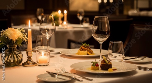 An elegantly set dining table for two, illuminated by candlelight, featuring gourmet food, wine glasses, and a floral centerpiece, creating a romantic and intimate atmosphere.