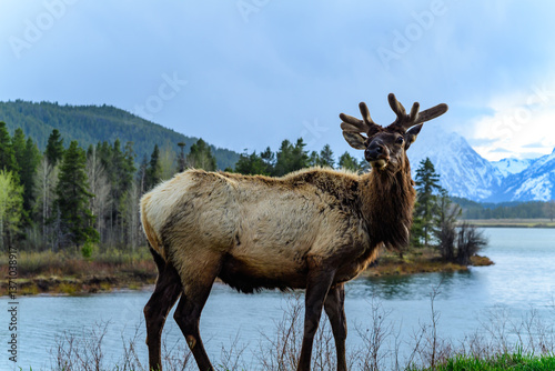 An elk with large antlers grazes on the side of the road near the river, Montana