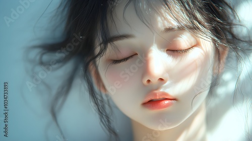 An emotionally withdrawn Asian girl in 3D style, her eyes closed, facial expression showing deep disappointment, soft pastels, light background, focus on human feelings