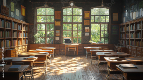 classroom, empty, desk, chair, bookshelf, window, window, light, shadow, wood, wooden, floor, school, education, learning, cognition, study, interior design, vintage, retro, classic, rustic, old, dark