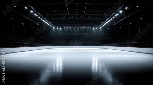 An empty ice rink under bright, white lights creates a serene and tranquil atmosphere. The smooth ice reflects the overhead lighting in a large, dimly lit arena.