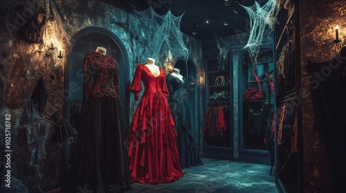 An empty scene featuring vibrant vampire costumes on mannequins amidst dark, cobweb-filled corners, creating an ideal product mockup space,