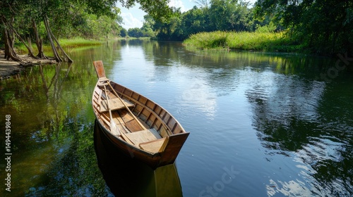 An empty wooden rowboat with oars sits peacefully on a calm river surrounded by lush green trees on a bright sunny day creating a tranquil scene of nature.