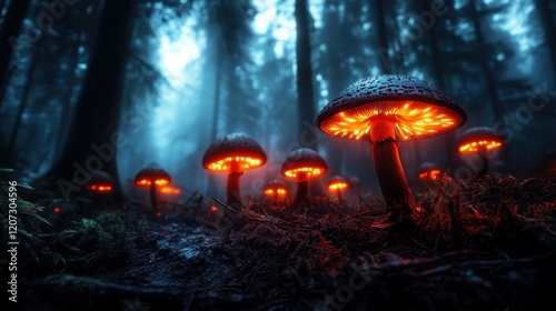 mushroom, glowing, fog, forest, enchanting, surreal, nature, beauty, magical, atmosphere, calmness, mystery, calmness, colours, light, aethereal, flora, wild, organic, fantasy, deep, shadow, serenity, vibrant, adventure, night, silence, peaceful, aesthetic, whimsical, exploration, secret, high-coloured, texture, landscape, wilderness, illumination, dreamlike, haunting, surrealism, plant, fungal