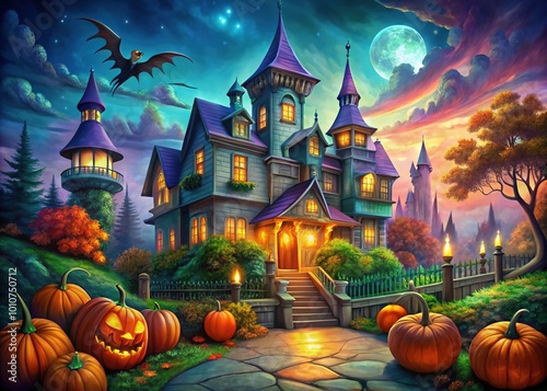 halloween, palace, illustration, skittish, enchanting, architecture, whimsical, night, moonlight, haunted, castle, fantasy, dark, mystical, eerie, pumpkin, bat, spider's web, autumn, seasonal, celebration, magic, folklore, mythical, scenery, art, decoration, ghostly, creature, fantasy art, imaginative, fairy tale, holiday, october, mysterious, atmospheric, dreamlike, surreal, festive