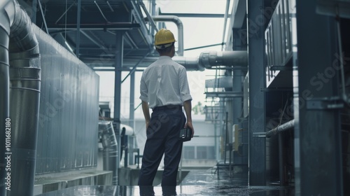 An engineer surveys an industrial site in the rain, wearing a hard hat and holding a tablet, determined amidst challenging conditions.