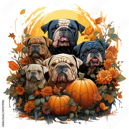 An English Bulldog Halloween t-shirt design featuring a group of bulldogs as cultivating a magical pumpkin garden, Generative Ai