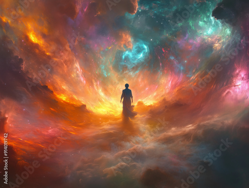 An enigmatic figure amidst swirling cosmic energy and vibrant hues, bathed in celestial light, captures a surreal, dreamlike essence of the ethereal cosmos.