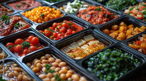 An enticing array of diverse, delicious foods placed in containers, highlighting vibrant and rich ingredients, spices, and herbs, presented in an orderly fashion for visual delight.