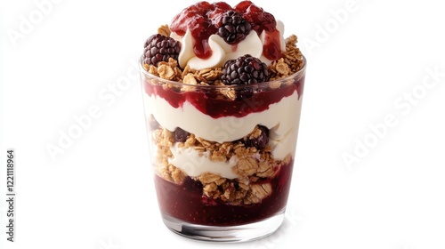 An enticing yogurt parfait featuring layers of creamy yogurt and juicy berries topped with granola, perfect for a healthy breakfast or dessert option.