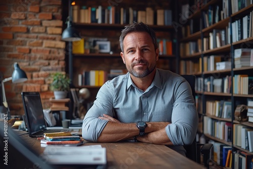 an entrepreneur in their office, surrounded by inspiring business books