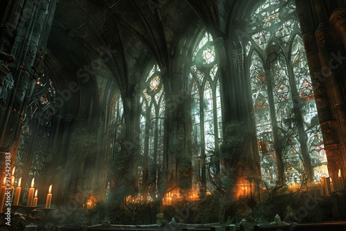 An ethereal gothic interior featuring majestic stained glass windows, dim lighting, and flickering candles, evoking a sense of mystery.