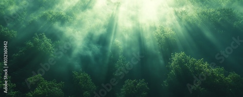 An ethereal image of sunlight breaking through the canopy of tall green trees in a mystical forest, perfect for serene nature photography
