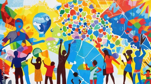 An evocative depiction of a diverse group of people painting a large mural together, with each section representing different aspects of their cultures