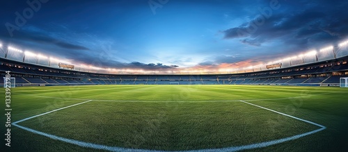 An expansive view of an empty soccer stadium with the green grass and stands illuminated by bright lights, capturing the essence of sports events.