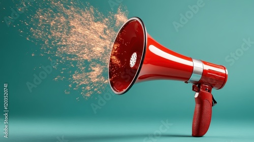 An explosive burst of vibrant energy emerges from a red megaphone, symbolizing powerful communication and the impact of sound in a dynamic and artistic way.