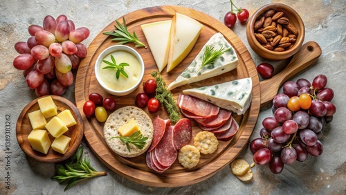 An Exquisite Arrangement of Gourmet Cheese, Cured Meats, and Fresh Fruits on a Rustic Wooden Board, Perfect for a Sophisticated Gathering