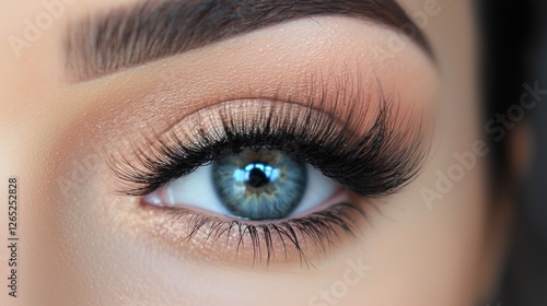 An exquisite female eye showcases vibrant blue hues, enhanced by extreme long false lashes. The makeup subtly emphasizes natural beauty, creating an alluring gaze