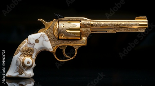 An exquisite golden revolver featuring white marble handles and delicate engraving, presenting an air of sophistication and luxury amidst a dark backdrop.