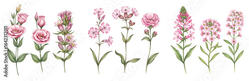 An exquisite hand-painted watercolor collection of various pink garden and wild flowers. A botanical illustration set isolated on a white background.