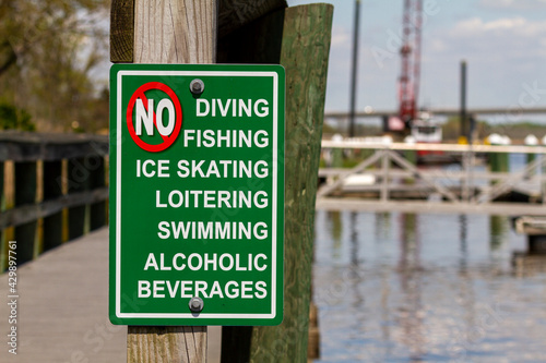 An extensive list of actions forbidden on the dock area are shown. The sign says no to diving, swimming, ice skating, loitering, fishing and alcoholic drinks. Supressive authoritarian regime concept.