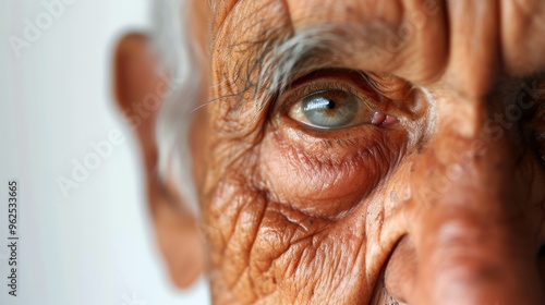 An extreme close-up shot focusing on the eye of an elderly man, revealing the intricate details and textures of his skin and eye. This image emphasizes the depth and story found in the human eye