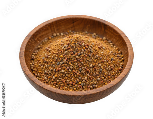 an eye level shot showcases a wooden bowl filled with a grainy mixture. the bowl's wood grain is visible, and its round shape contrasts with the irregular texture of its contents
