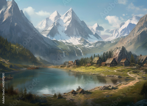 An idyllic mountain scene, where emerald greenery and bluish water embraces a serene lake, creating a tranquil harmony with nature green beneath the towering peaks.