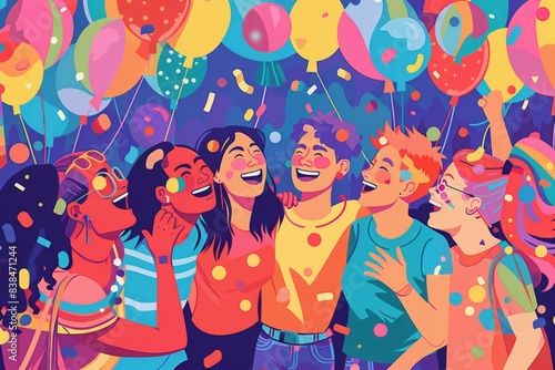 An illustration of a group of friends of different gender identities and sexual orientations, laughing and hugging at a pride event, with colorful decorations in the background