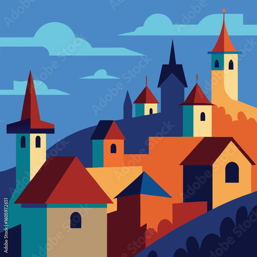 illustration, village, church, rural, landscape, scenic, picturesque, idylli, nature, peaceful, tranquil, beautiful, town, classic, architecture, historic, traditional, serene, fantasy, art, drawing, vignetting, graphic, digital, watercolor, painting, silhouette, sky, green, country, countryside, home, house, church steeple, cross, christianity, religion, worship, calm, environment, nobody, vintage, european, old, summer, spring, travel, tour tourism