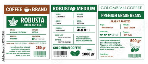 An illustration of coffee labels template, showcasing Robusta Blend and Premium Grade Beans in cmyk mode with two tone color. The labels detail various coffee attributes such as origin, altitude, roas