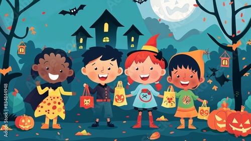 halloween, children, illustration, colourful, costume, standing, candy, haunted, house, background, highlighting, joy, excitement, night, cartoon, children, children, vector, school, baby, children, childhood, holiday, character